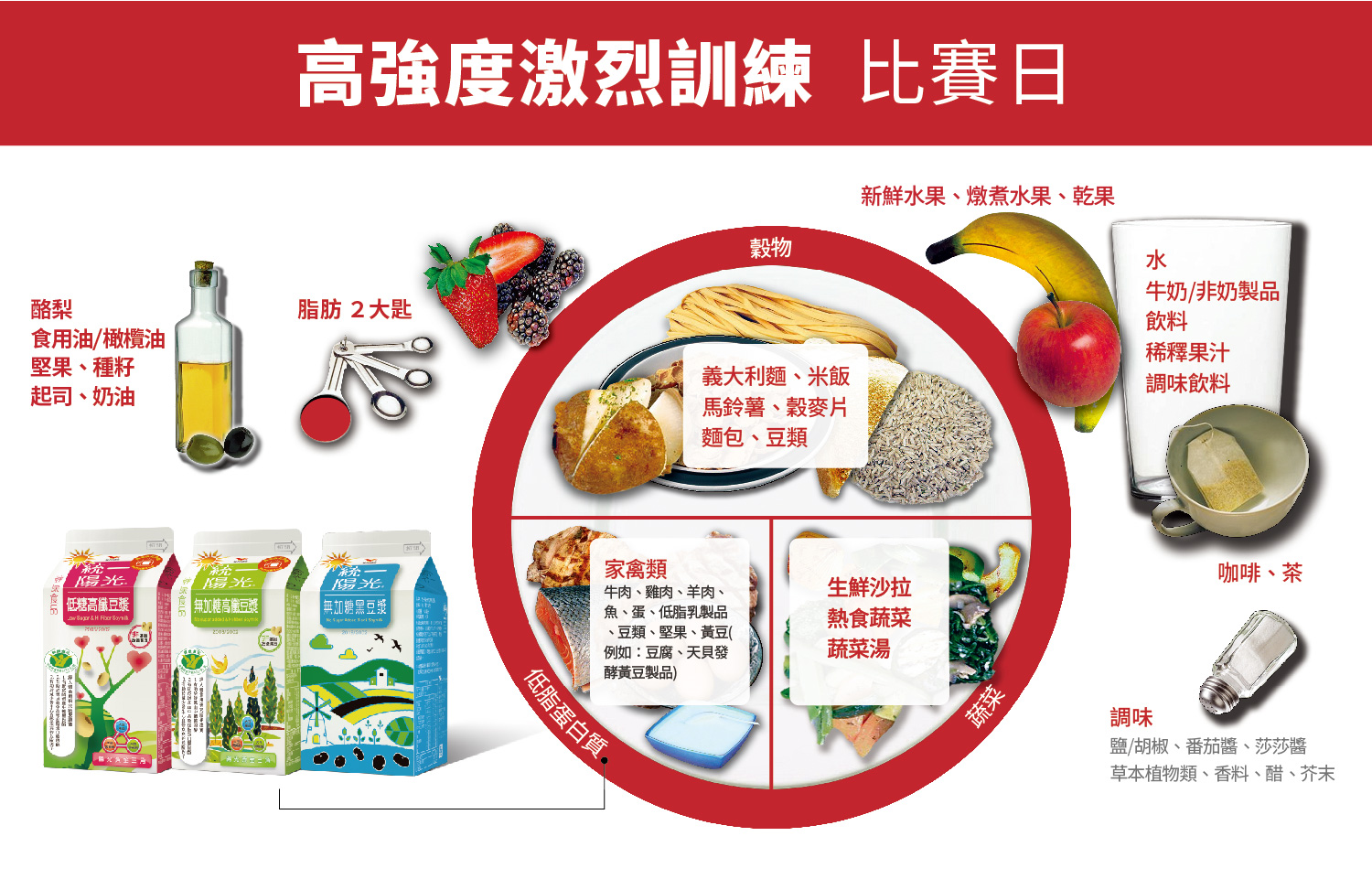 營養的攝取會隨著訓練量/強度/目標而改變。簡單如下圖示介紹,當今天進行的是輕鬆運動或是要體重管理者,可以吃藍色餐盤;灰色餐盤則是中等強度運動的你可以考慮;當你今天進行的是激烈運動,運動前後建議可以參考紅色餐盤的搭配。